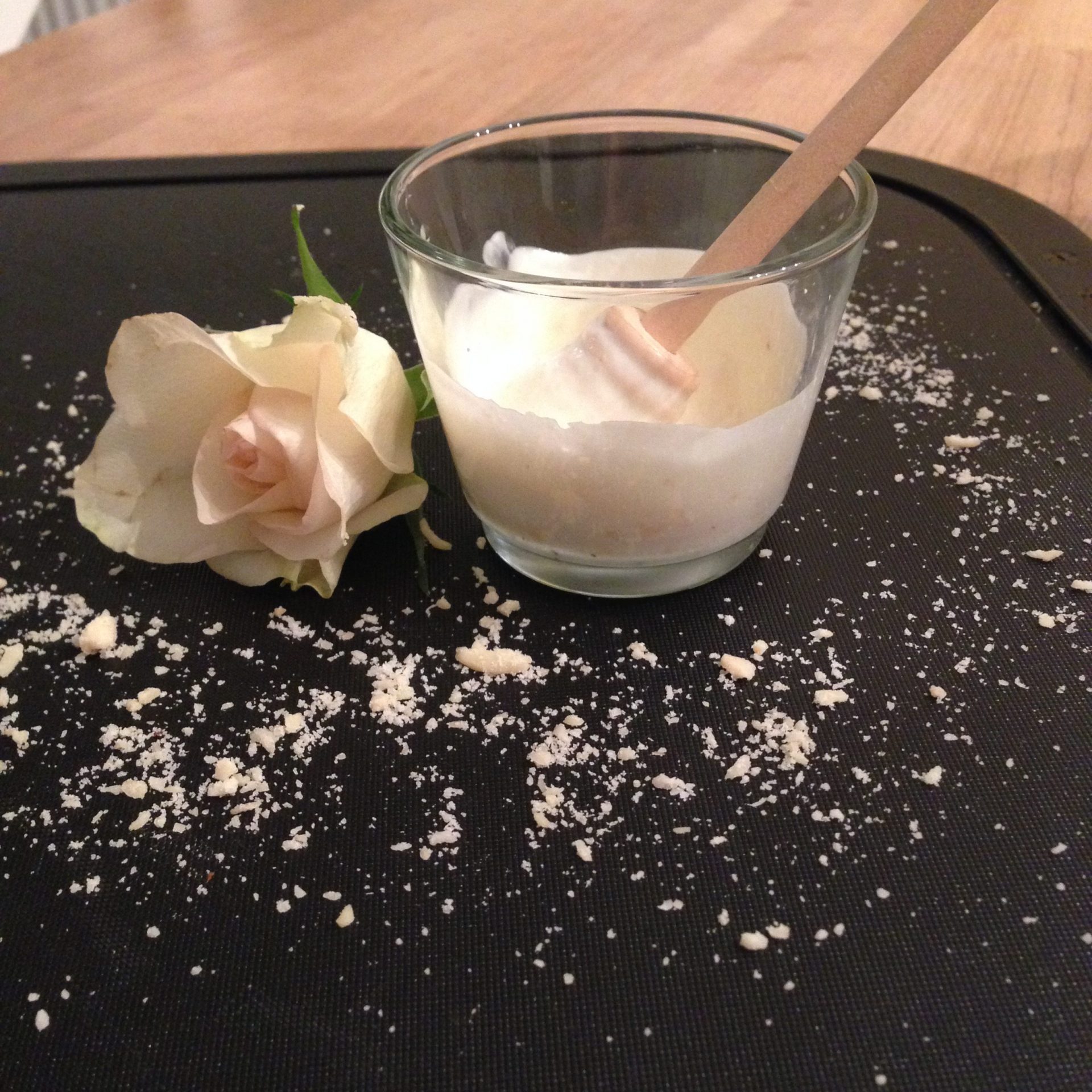 Hier darfst du etwas spielerisch sein. Die Menge der Creme richtet sich nach deinem Wunsch und Größe des Gefäßes. Wichtig ist das Verhältnis mit Wasser, damit eine feine Konsistenz entsteht. Mit den Ätherischen Ölen bitte sparsam umgehen. Es reichen meist 2-3 Tropfen. Ein Zuviel an Ätherischen Ölen kann die Haut reizen. Ich verwende neben Rose gerne Citronella, Grapefruit, Zitrone und Bergamotte. Sie haben eine Hautstraffende Wirkung. Nun kannst du alles mit einem Glasstäbchen zu einer geschmeidigen Creme anrühren.