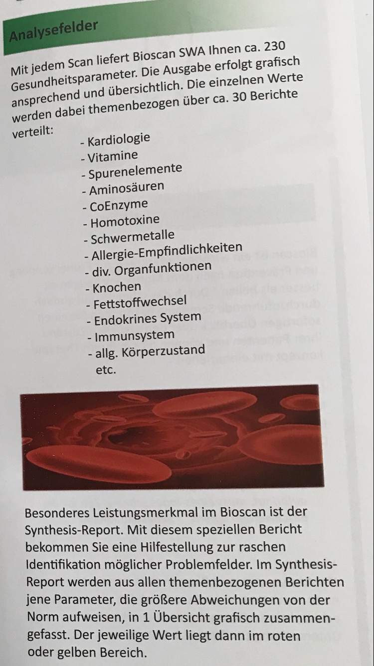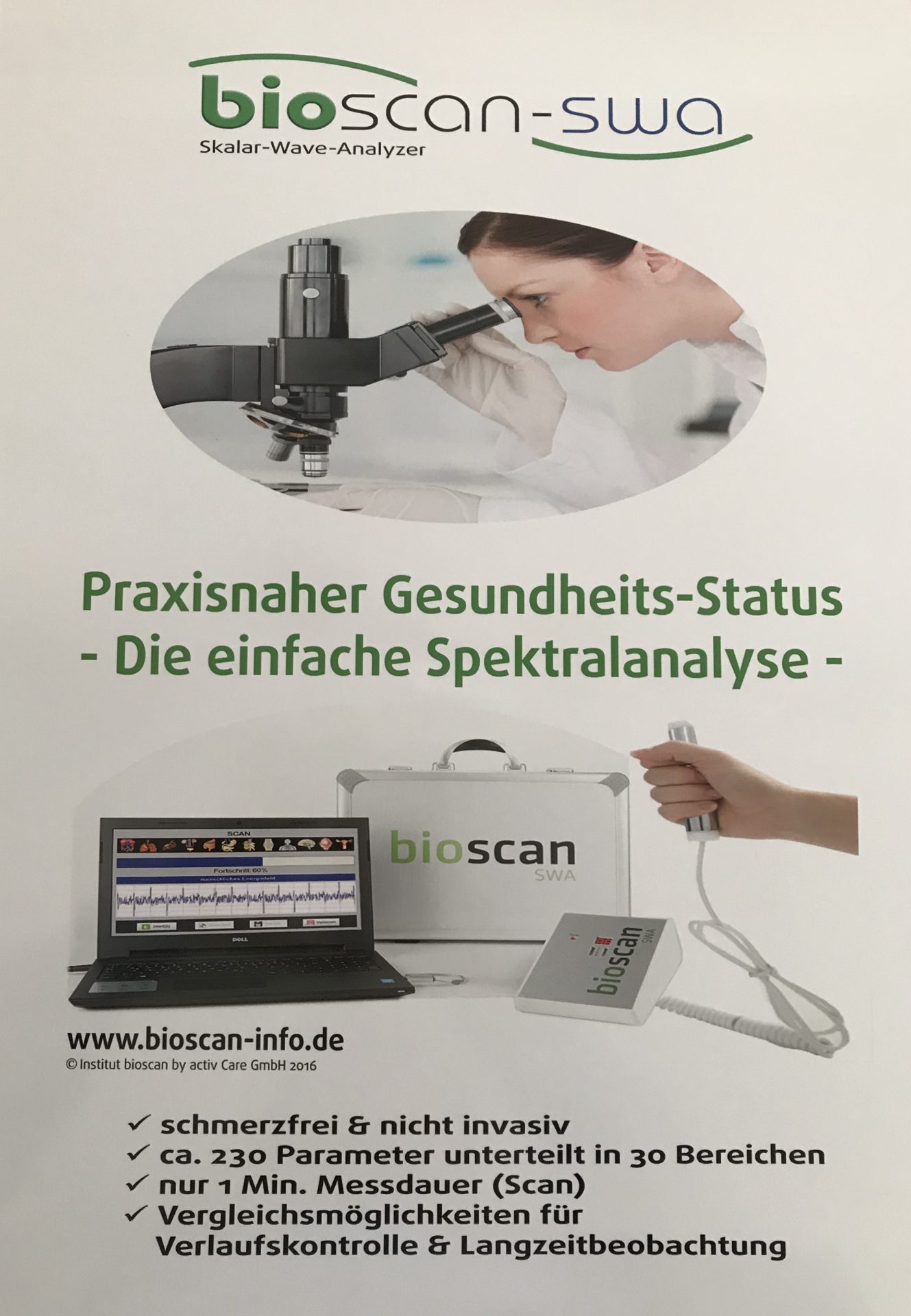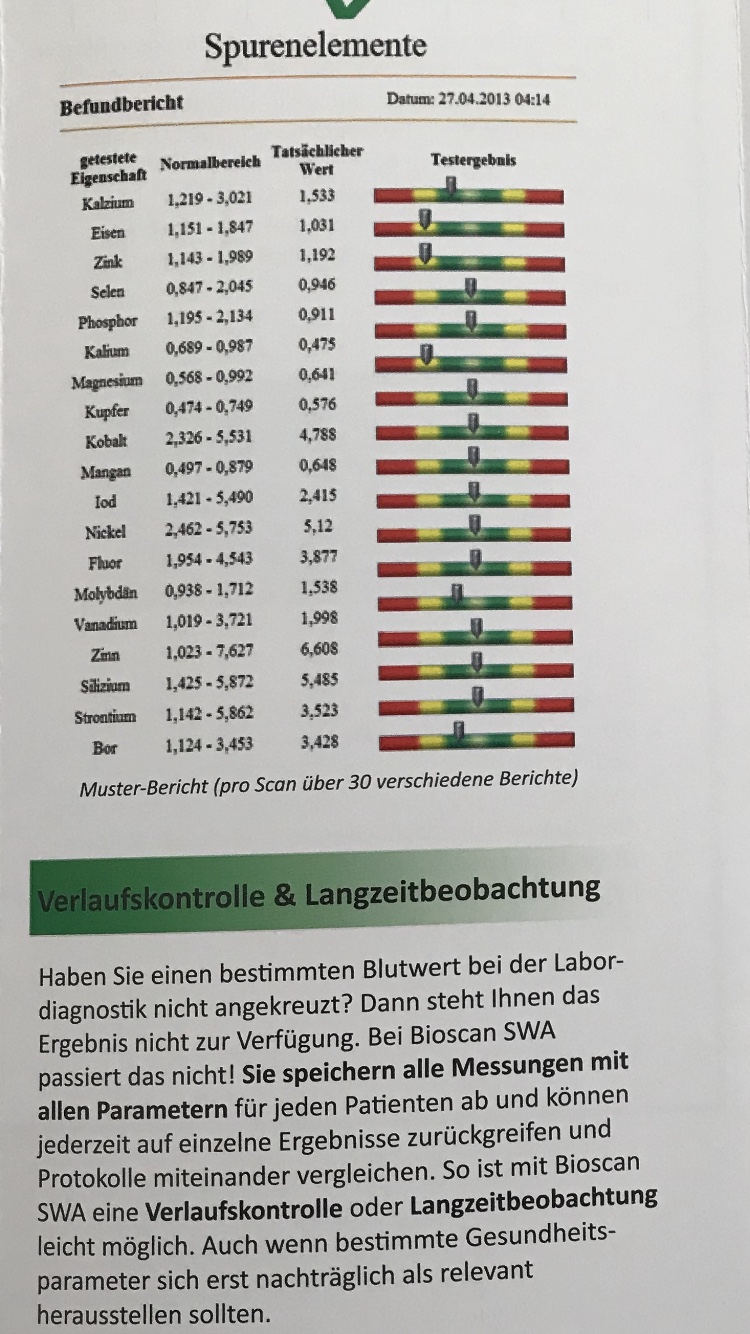 Hinweis: Die bioenergetische Spektralanalyse mit dem Bioscan SWA und die hieraus resultierenden Ergebnisse sind schulmedizinisch nicht anerkannt und wissenschaftlich umstritten. Die Analyse mit dem Bioscan SWA ersetzt keine schulmedizinisch anerkannte Diagnosemethoden. Dennoch kann der Bioscan SWA wertvolle Erkenntnisse liefern, die für die Entwicklung einer ganzheitlichen Behandlungsstrategie hilfreich sind.